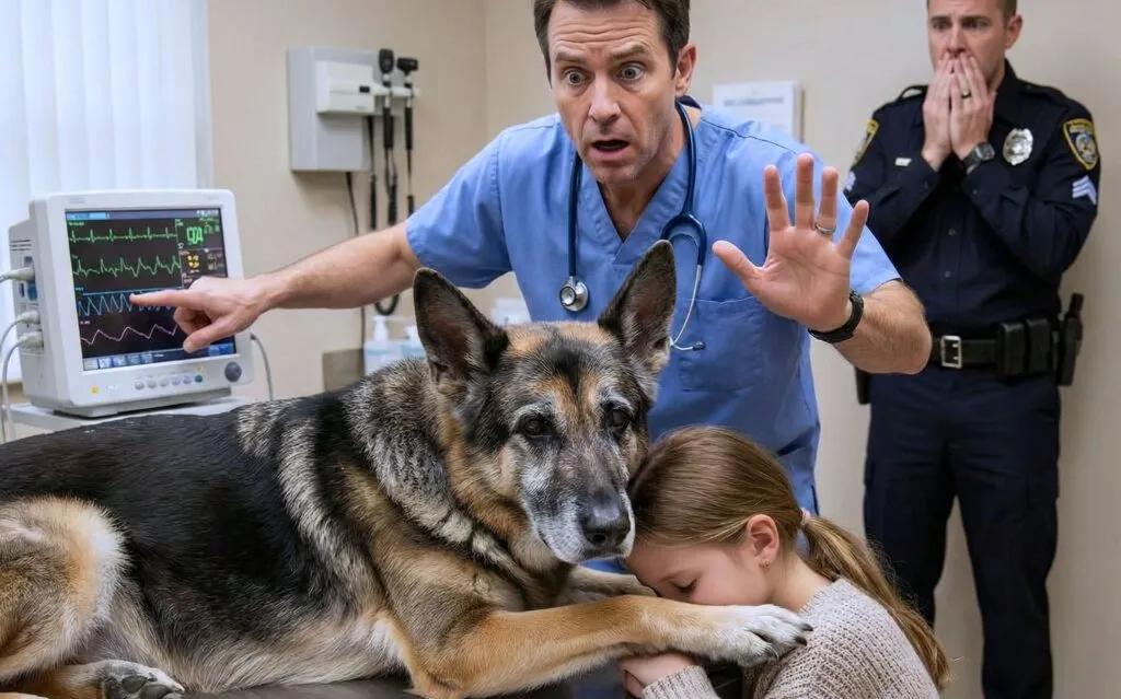 Everyone froze, and then something happened that no one expected. The dying dog lifted his paw slowly, fighting against his own failing body, and wrapped it around the girl in one final hug. Every heart in the room broke; even the toughest officers turned away, unable to watch the heartbreaking goodbye. In that moment, the vet took a step forward, staring at the animal with confusion, then sudden alarm. Something was wrong. His eyes widened, and his voice cracked.