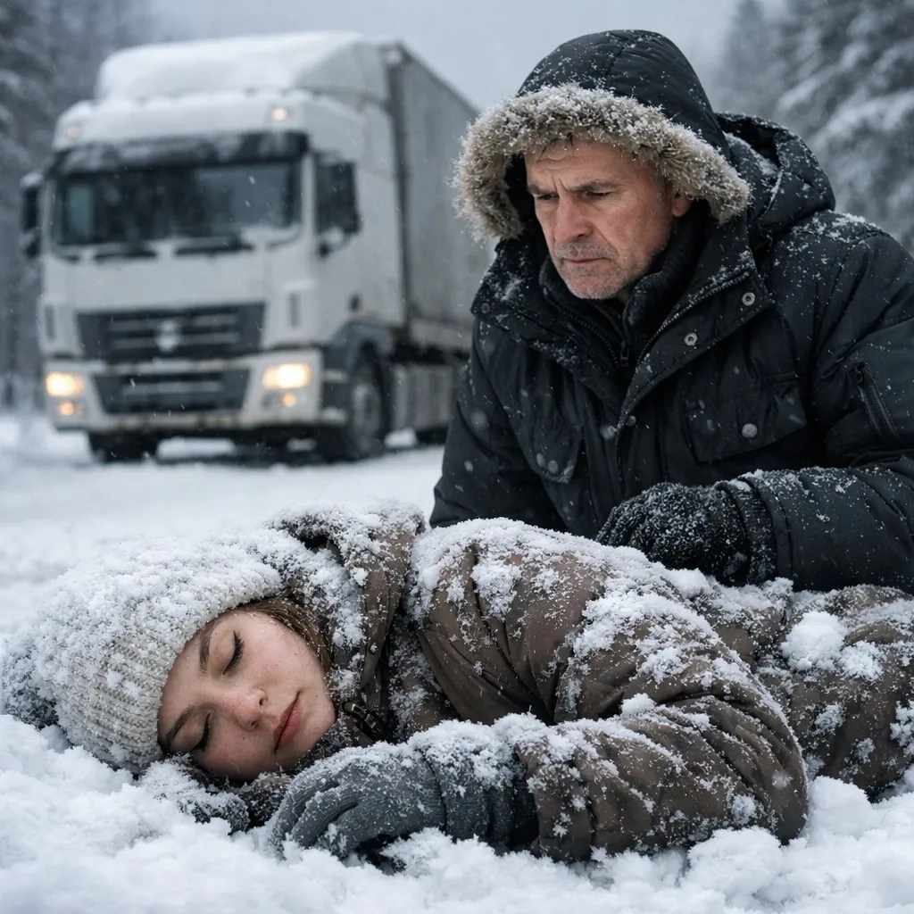 Накинув на плечи плотное зимнее пальто, Андрей поспешно выбрался из теплой кабины в бушующий холод. Его тяжелые ботинки громко захрустели по свежевыпавшему снегу, когда он приблизился к лежащему телу. Перед ним лежала молодая женщина, свернувшаяся в позу эмбриона в попытке сохранить тепло. Ее тело уже наполовину занесло снегом, и она не подавала признаков движения. Андрей опустился рядом на корточки, выпуская изо рта облака пара в морозный воздух, и осторожно протянул руку, смахивая снежную крошку с ее лица.